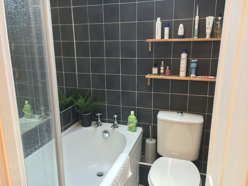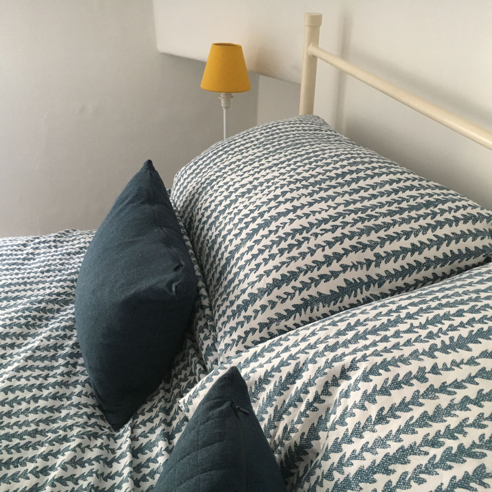 The kitchen looks out onto the courtyard and is modern and seaside-y with open oak shelves. Upstairs, the bedroom has a comfy double bed with lovely cotton bedding and towels provided. The small upstairs bathroom has a roof light, slate tiles and a choice of a bath or shower.